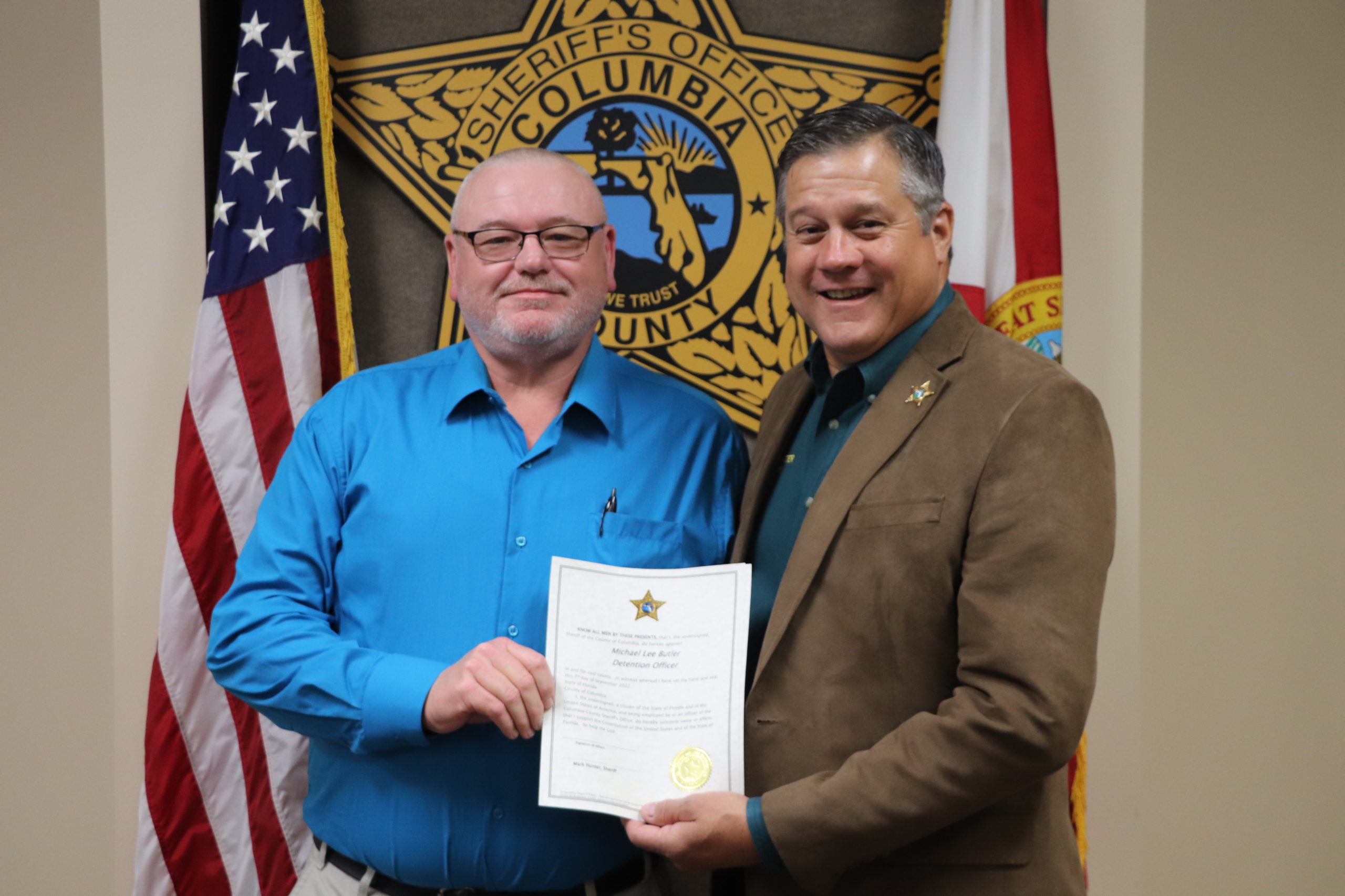 On Wednesday September 7, 2022 Sheriff Hunter held a swearing in ceremony at the CCSO Operations Center. The ceremony was attended by family, friends, and CCSO employees. Michael Butler was sworn in as a detention officer. He joins CCSO with prior experience from the Florida Department of Corrections. Sheriff Hunter also welcomed back Harry Paul Lee Jr, who was previously employed with us. Both Butler and Lee will be assigned to the Columbia County Detention Facility. Please help us welcome these gentlemen to our team!
